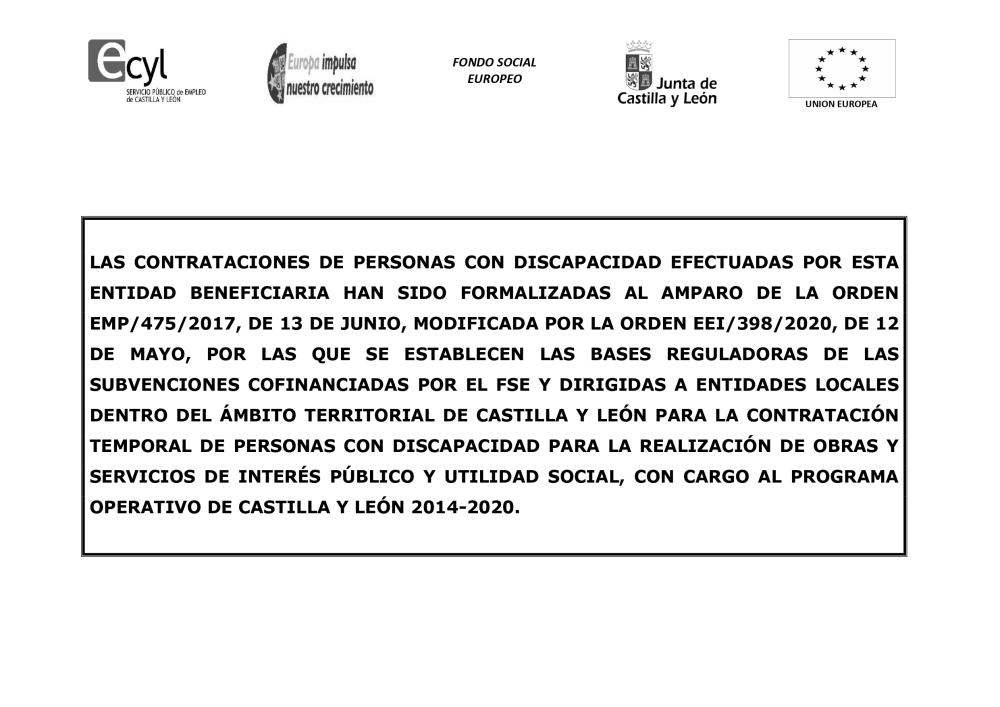 LAS CONTRATACIONES DE PERSONAS CON DISCAPACIDAD EFECTUADAS POR ESTA ENTIDAD BENEFICIARIA HAN SIDO FORMALIZADAS AL AMPARO DE LA ORDEN EMP/475/2017, DE 13 DE JUNIO, MODIFICADA POR LA ORDEN EEI/398/2020, DE 12 DE MAYO, POR LAS QUE SE ESTABLECEN LAS BASES REGULADORAS DE LAS SUBVENCIONES COFINANCIADAS POR EL FSE Y DIRIGIDAS A ENTIDADES LOCALES DENTRO DEL ÁMBITO TERRITORIAL DE CASTILLA Y LEÓN PARA LA CONTRATACIÓN TEMPORAL DE PERSONAS CON DISCAPACIDAD PARA LA REALIZACIÓN DE OBRAS Y SERVICIOS DE INTERÉS PÚBLICO Y UTILIDAD SOCIAL, CON CARGO AL PROGRAMA OPERATIVO DE CASTILLA Y LEÓN 2014-2020.LAS CONTRATACIONES DE PERSONAS CON DISCAPACIDAD EFECTUADAS POR ESTA ENTIDAD BENEFICIARIA HAN SIDO FORMALIZADAS AL AMPARO DE LA ORDEN EMP/475/2017, DE 13 DE JUNIO, MODIFICADA POR LA ORDEN EEI/398/2020, DE 12 DE MAYO, POR LAS QUE SE ESTABLECEN LAS BASES REGULADORAS DE LAS SUBVENCIONES COFINANCIADAS POR EL FSE Y DIRIGIDAS A ENTIDADES LOCALES DENTRO DEL ÁMBITO TERRITORIAL DE CASTILLA Y LEÓN PARA LA CONTRATACIÓN TEMPORAL DE PERSONAS CON DISCAPACIDAD PARA LA REALIZACIÓN DE OBRAS Y SERVICIOS DE INTERÉS PÚBLICO Y UTILIDAD SOCIAL, CON CARGO AL PROGRAMA OPERATIVO DE CASTILLA Y LEÓN 2014-2020.LAS CONTRATACIONES DE PERSONAS CON DISCAPACIDAD EFECTUADAS POR ESTA ENTIDAD BENEFICIARIA HAN SIDO FORMALIZADAS AL AMPARO DE LA ORDEN EMP/475/2017, DE 13 DE JUNIO, MODIFICADA POR LA ORDEN EEI/398/2020, DE 12 DE MAYO, POR LAS QUE SE ESTABLECEN LAS BASES REGULADORAS DE LAS SUBVENCIONES COFINANCIADAS POR EL FSE Y DIRIGIDAS A ENTIDADES LOCALES DENTRO DEL ÁMBITO TERRITORIAL DE CASTILLA Y LEÓN PARA LA CONTRATACIÓN TEMPORAL DE PERSONAS CON DISCAPACIDAD PARA LA REALIZACIÓN DE OBRAS Y SERVICIOS DE INTERÉS PÚBLICO Y UTILIDAD SOCIAL, CON CARGO AL PROGRAMA OPERATIVO DE CASTILLA Y LEÓN 2014-2020.LAS CONTRATACIONES DE PERSONAS CON DISCAPACIDAD EFECTUADAS POR ESTA ENTIDAD BENEFICIARIA HAN SIDO FORMALIZADAS AL AMPARO DE LA ORDEN EMP/475/2017, DE 13 DE JUNIO, MODIFICADA POR LA ORDEN EEI/398/2020, DE 12 DE MAYO, POR LAS QUE SE ESTABLECEN LAS BASES REGULADORAS DE LAS SUBVENCIONES COFINANCIADAS POR EL FSE Y DIRIGIDAS A ENTIDADES LOCALES DENTRO DEL ÁMBITO TERRITORIAL DE CASTILLA Y LEÓN PARA LA CONTRATACIÓN TEMPORAL DE PERSONAS CON DISCAPACIDAD PARA LA REALIZACIÓN DE OBRAS Y SERVICIOS DE INTERÉS PÚBLICO Y UTILIDAD SOCIAL, CON CARGO AL PROGRAMA OPERATIVO DE CASTILLA Y LEÓN 2014-2020.